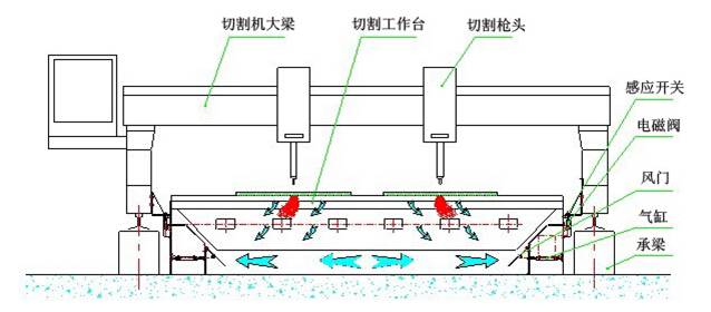 下吸式煙塵凈化系統(tǒng)抽風(fēng)是通過(guò)下吸式抽風(fēng)切割臺(tái)來(lái)實(shí)現(xiàn)的,下吸式抽風(fēng)切割臺(tái)分成若干個(gè)區(qū)域,每個(gè)區(qū)域設(shè)計(jì)有風(fēng)門(mén)吸風(fēng),切割槍頭在每個(gè)區(qū)域切割時(shí),相應(yīng)區(qū)域的風(fēng)門(mén)打開(kāi)抽風(fēng),將切割機(jī)的粉塵吸除。